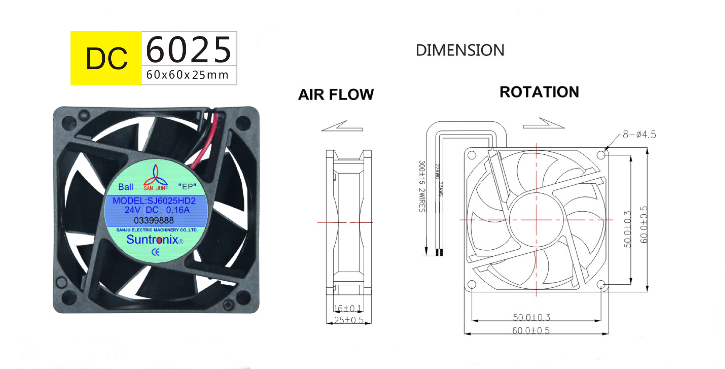 尺寸:60x60x25mm 框架: UL94V-0 PBT 軸承: 含油軸承& 雙滾珠軸承 電壓:DC 5V 12V 24V 48V 壽命:50 000Hours at 25℃--滾珠軸承 30 000Hours at 25℃--含油軸承 工作溫度:-20℃~70℃ 正常濕度 儲存溫度:-20℃~85℃ 正常濕度